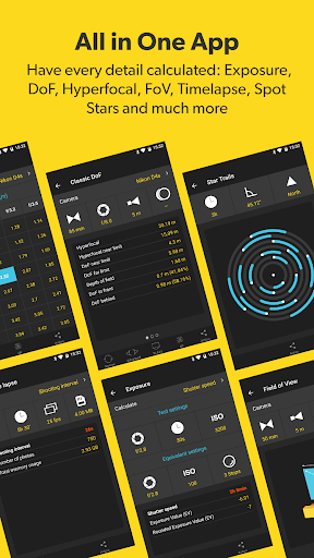 – Calculators: Long Exposure, Timelapse, Spot Stars, Star Trails, Hyperfocal Table, DoF, FoV
